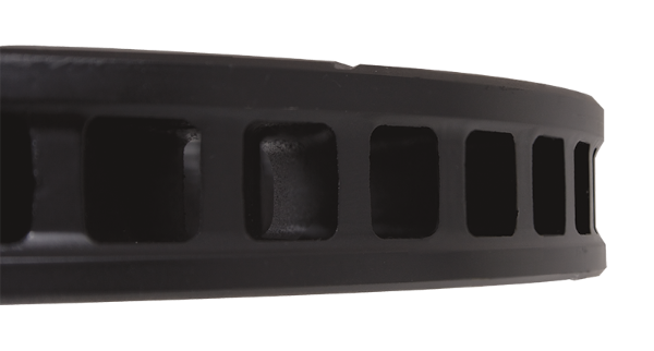 Tarcze EBC Racing wyposażone są w 48 wewnętrznych, kierunkowych (prawo-lewo) kominów wentylacyjnych, których zadaniem jest chłodzenie tarczy. - Flansza (tzw. dzwon) zastosowana w tarczach EBC Racing jest precyzyjnie wycięta z kawałka aluminium wykorzystywanego w przemyśle lotniczym i kosmicznym, dzięki czemu jest mocna i lekka. Flansza anodowana jest na czarno, dzięki czemu ma wysoką odporność na korozję i wysokie walory estetyczne. Flansza może być wykorzystywana do różnych tarcz hamulcowych.
