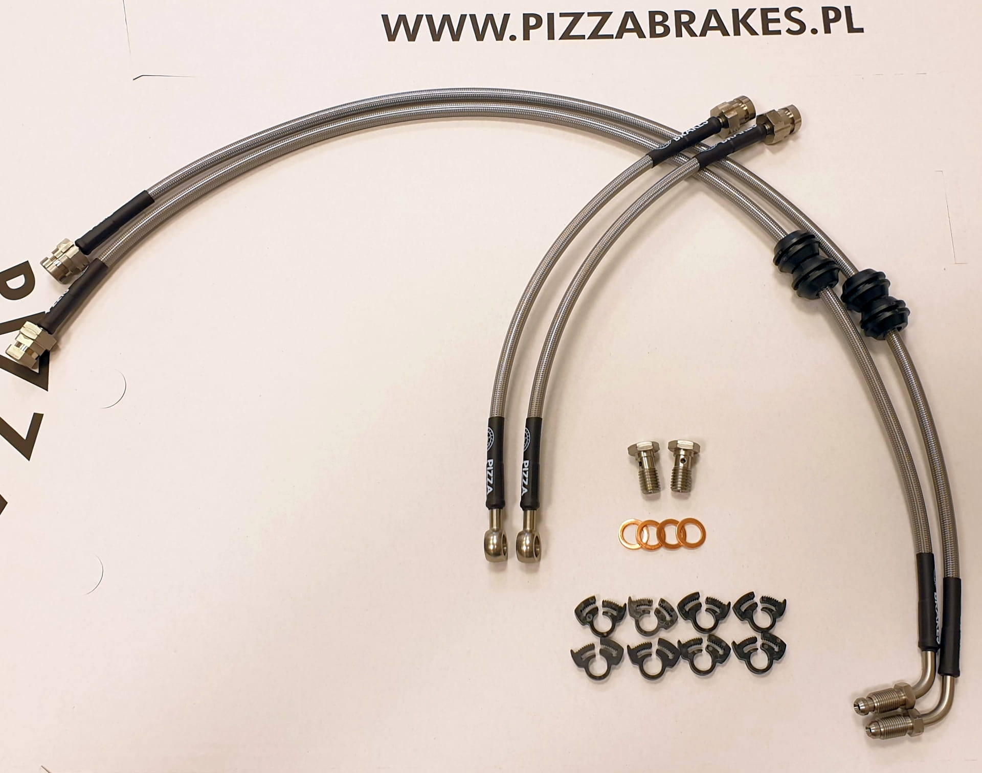 Zestaw przewodów hamulcowych w stalowym oplocie jest wyprodukowany specjalnie dla Ciebie przy użyciu najwyższej jakości końcówek ze stali nierdzewnej zaciśniętych bezpośrednio na nierozciągliwym teflonowym przewodzie w gęstym stalowym oplocie.
