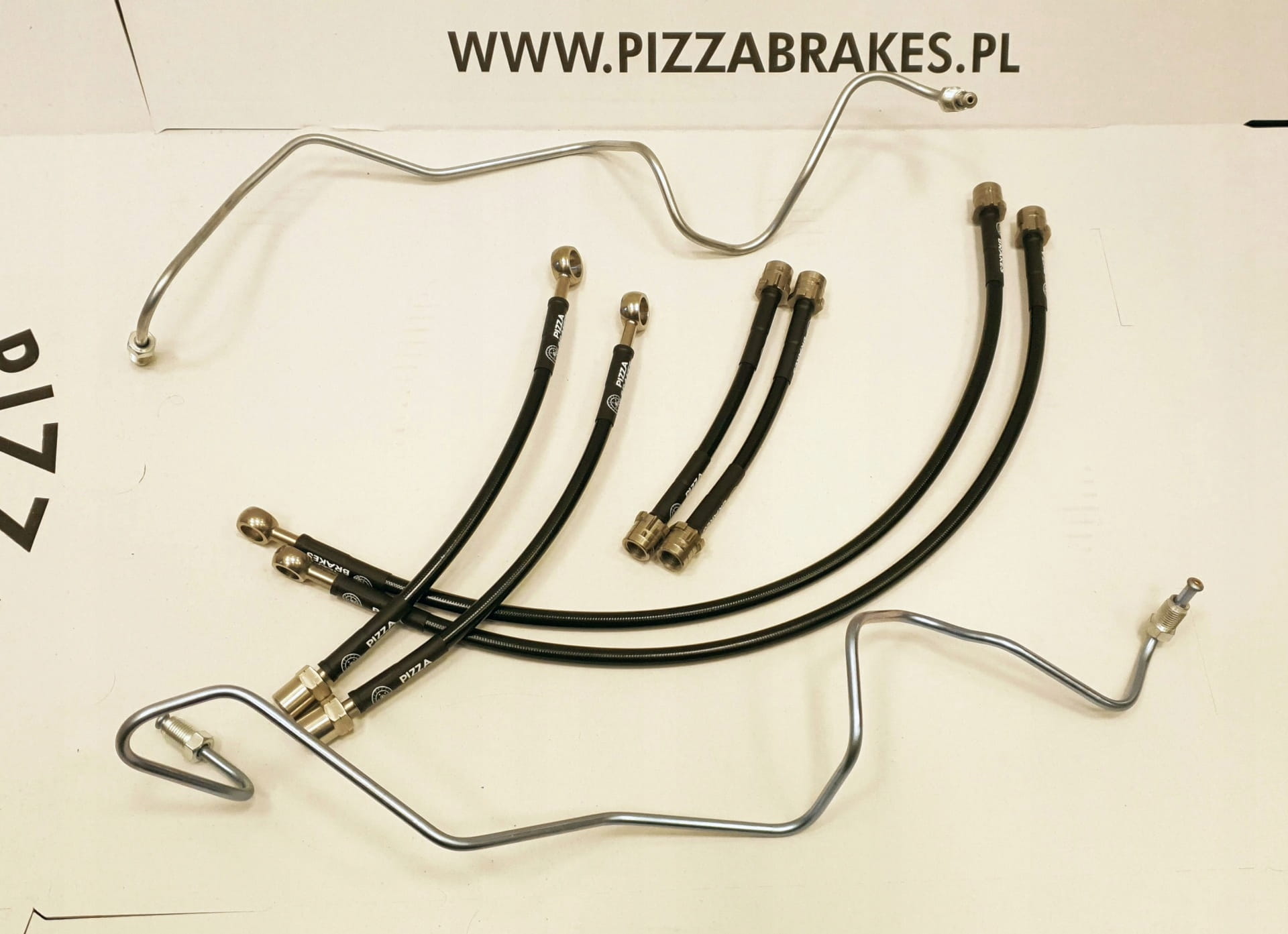 Zestaw składa się z 6 sztuk przewodów w stalowym oplocie (na przód i tył pojazdu) oraz dwóch metalowych przewodów