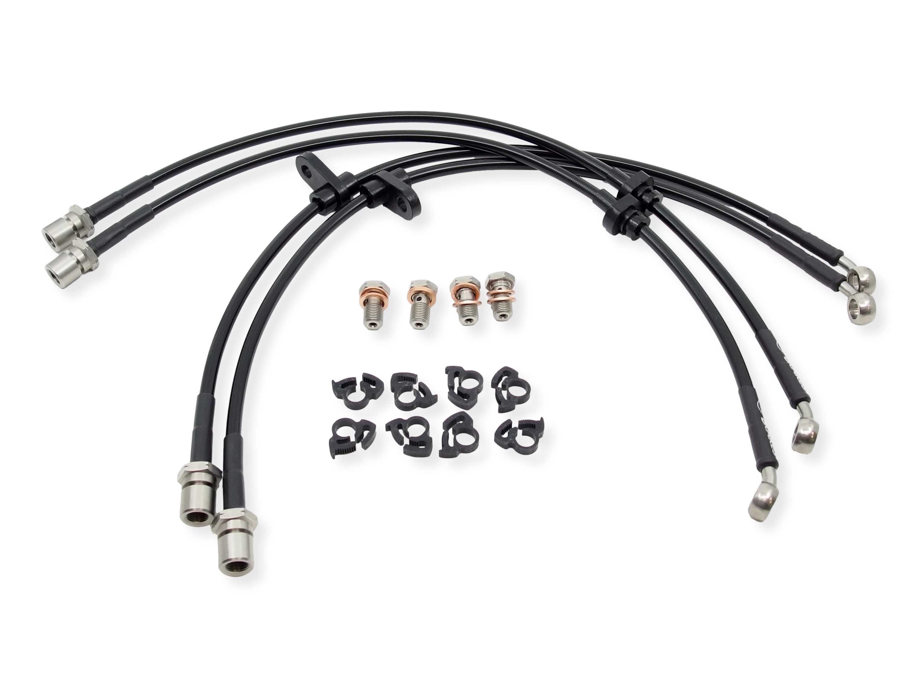 Zestaw przewodów hamulcowych w stalowym oplocie jest wyprodukowany specjalnie dla Ciebie przy użyciu najwyższej jakości końcówek ze stali nierdzewnej zaciśniętych bezpośrednio na nierozciągliwym teflonowym przewodzie w gęstym stalowym oplocie.
